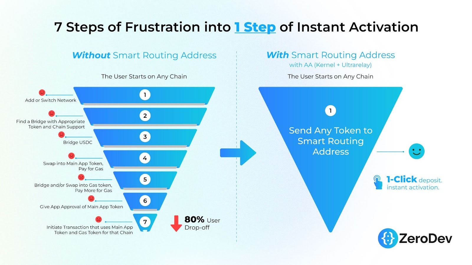 ZeroDev’s Smart Routing Address is the strategic fix. It's the Universal Deposit Endpoint that abstracts away bridging, swapping and gas, delivering instant, gas-ready funds to your users with a single transaction.